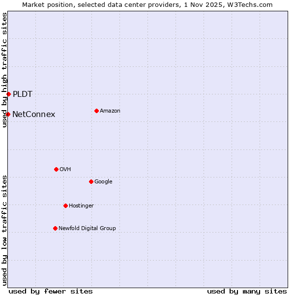 TechnologiesContent ManagementServer-side Languages Client-side Languages JavaScript Libraries CSS Frameworks Web Servers Web Panels Operating Systems Web Hosting Data Centers Reverse Proxies DNS Servers Email Servers SSL Certificate Authorities Content Delivery Traffic Analysis Tools Advertising Networks Tag Managers Social Widgets Site Elements Structured Data Markup Languages Character Encodings Image File Formats Top Level Domains Server Locations Content Languages ComparisonCompare with other | Technologies > Data Centers > Technology usage comparison Comparison of the usage statistics of PLDT vs. NetConnex for websitesThis report shows the usage statistics of PLDT vs. NetConnex as data center provider on the web. See technologies overview for explanations on the methodologies used in the surveys. Our reports are updated daily. UsageThis diagram shows the percentages of websites using the selected technologies. How to read the diagram: