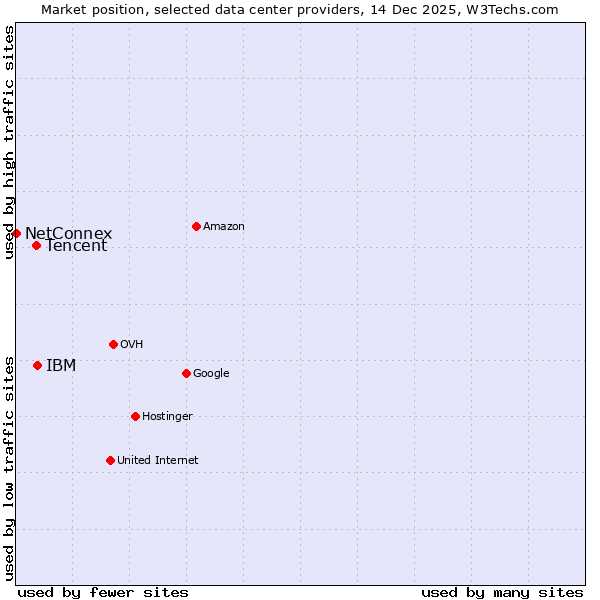 TechnologiesContent ManagementServer-side Languages Client-side Languages JavaScript Libraries CSS Frameworks Web Servers Web Panels Operating Systems Web Hosting Data Centers Reverse Proxies DNS Servers Email Servers SSL Certificate Authorities Content Delivery Traffic Analysis Tools Advertising Networks Tag Managers Social Widgets Site Elements Structured Data Markup Languages Character Encodings Image File Formats Top Level Domains Server Locations Content Languages | Technologies > Data Centers > Technology usage comparison Comparison of the usage statistics of IBM vs. Tencent vs. NetConnex for websitesThis report shows the usage statistics of IBM vs. Tencent vs. NetConnex as data center provider on the web. See technologies overview for explanations on the methodologies used in the surveys. Our reports are updated daily. UsageThis diagram shows the percentages of websites using the selected technologies. How to read the diagram: