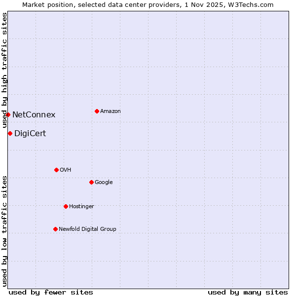 TechnologiesContent ManagementServer-side Languages Client-side Languages JavaScript Libraries CSS Frameworks Web Servers Web Panels Operating Systems Web Hosting Data Centers Reverse Proxies DNS Servers Email Servers SSL Certificate Authorities Content Delivery Traffic Analysis Tools Advertising Networks Tag Managers Social Widgets Site Elements Structured Data Markup Languages Character Encodings Image File Formats Top Level Domains Server Locations Content Languages ComparisonCompare with other | Technologies > Data Centers > Technology usage comparison Comparison of the usage statistics of DigiCert vs. NetConnex for websitesThis report shows the usage statistics of DigiCert vs. NetConnex as data center provider on the web. See technologies overview for explanations on the methodologies used in the surveys. Our reports are updated daily. UsageThis diagram shows the percentages of websites using the selected technologies. How to read the diagram: