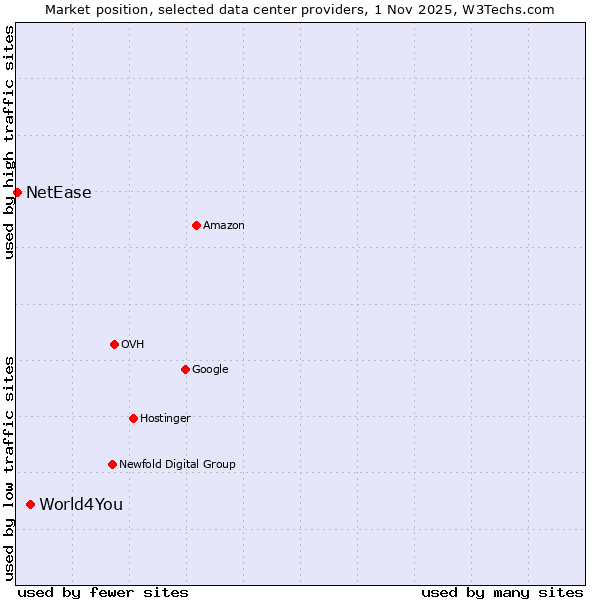 TechnologiesContent ManagementServer-side Languages Client-side Languages JavaScript Libraries CSS Frameworks Web Servers Web Panels Operating Systems Web Hosting Data Centers Reverse Proxies DNS Servers Email Servers SSL Certificate Authorities Content Delivery Traffic Analysis Tools Advertising Networks Tag Managers Social Widgets Site Elements Structured Data Markup Languages Character Encodings Image File Formats Top Level Domains Server Locations Content Languages ComparisonCompare with other | Technologies > Data Centers > Technology usage comparison Comparison of the usage statistics of World4You vs. NetEase for websitesThis report shows the usage statistics of World4You vs. NetEase as data center provider on the web. See technologies overview for explanations on the methodologies used in the surveys. Our reports are updated daily. UsageThis diagram shows the percentages of websites using the selected technologies. How to read the diagram: