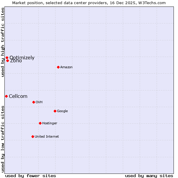 TechnologiesContent ManagementServer-side Languages Client-side Languages JavaScript Libraries CSS Frameworks Web Servers Web Panels Operating Systems Web Hosting Data Centers Reverse Proxies DNS Servers Email Servers SSL Certificate Authorities Content Delivery Traffic Analysis Tools Advertising Networks Tag Managers Social Widgets Site Elements Structured Data Markup Languages Character Encodings Image File Formats Top Level Domains Server Locations Content Languages | Technologies > Data Centers > Technology usage comparison Comparison of the usage statistics of Zoho vs. Optimizely vs. Cellcom for websitesThis report shows the usage statistics of Zoho vs. Optimizely vs. Cellcom as data center provider on the web. See technologies overview for explanations on the methodologies used in the surveys. Our reports are updated daily. UsageThis diagram shows the percentages of websites using the selected technologies. How to read the diagram: