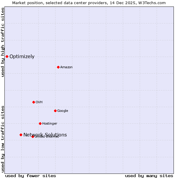 TechnologiesContent ManagementServer-side Languages Client-side Languages JavaScript Libraries CSS Frameworks Web Servers Web Panels Operating Systems Web Hosting Data Centers Reverse Proxies DNS Servers Email Servers SSL Certificate Authorities Content Delivery Traffic Analysis Tools Advertising Networks Tag Managers Social Widgets Site Elements Structured Data Markup Languages Character Encodings Image File Formats Top Level Domains Server Locations Content Languages ComparisonCompare with other | Technologies > Data Centers > Technology usage comparison Comparison of the usage statistics of Network Solutions vs. Optimizely for websitesThis report shows the usage statistics of Network Solutions vs. Optimizely as data center provider on the web. See technologies overview for explanations on the methodologies used in the surveys. Our reports are updated daily. UsageThis diagram shows the percentages of websites using the selected technologies. How to read the diagram: