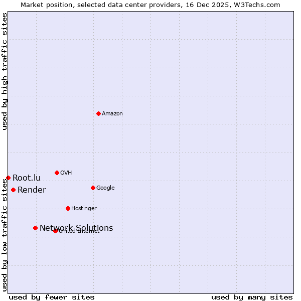 TechnologiesContent ManagementServer-side Languages Client-side Languages JavaScript Libraries CSS Frameworks Web Servers Web Panels Operating Systems Web Hosting Data Centers Reverse Proxies DNS Servers Email Servers SSL Certificate Authorities Content Delivery Traffic Analysis Tools Advertising Networks Tag Managers Social Widgets Site Elements Structured Data Markup Languages Character Encodings Image File Formats Top Level Domains Server Locations Content Languages | Technologies > Data Centers > Technology usage comparison Comparison of the usage statistics of Network Solutions vs. Render vs. Root.lu for websitesThis report shows the usage statistics of Network Solutions vs. Render vs. Root.lu as data center provider on the web. See technologies overview for explanations on the methodologies used in the surveys. Our reports are updated daily. UsageThis diagram shows the percentages of websites using the selected technologies. How to read the diagram: