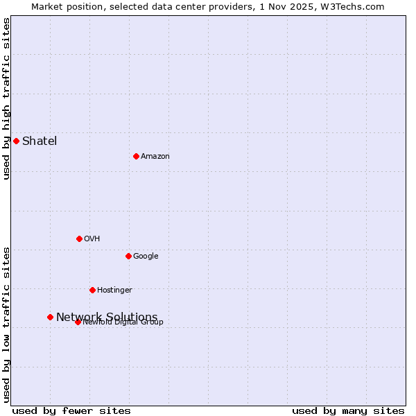 TechnologiesContent ManagementServer-side Languages Client-side Languages JavaScript Libraries CSS Frameworks Web Servers Web Panels Operating Systems Web Hosting Data Centers Reverse Proxies DNS Servers Email Servers SSL Certificate Authorities Content Delivery Traffic Analysis Tools Advertising Networks Tag Managers Social Widgets Site Elements Structured Data Markup Languages Character Encodings Image File Formats Top Level Domains Server Locations Content Languages ComparisonCompare with other | Technologies > Data Centers > Technology usage comparison Comparison of the usage statistics of Network Solutions vs. Shatel for websitesThis report shows the usage statistics of Network Solutions vs. Shatel as data center provider on the web. See technologies overview for explanations on the methodologies used in the surveys. Our reports are updated daily. UsageThis diagram shows the percentages of websites using the selected technologies. How to read the diagram: