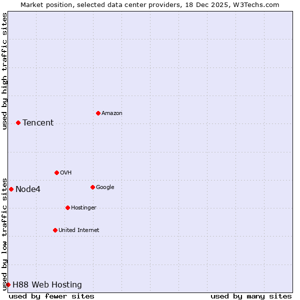 TechnologiesContent ManagementServer-side Languages Client-side Languages JavaScript Libraries CSS Frameworks Web Servers Web Panels Operating Systems Web Hosting Data Centers Reverse Proxies DNS Servers Email Servers SSL Certificate Authorities Content Delivery Traffic Analysis Tools Advertising Networks Tag Managers Social Widgets Site Elements Structured Data Markup Languages Character Encodings Image File Formats Top Level Domains Server Locations Content Languages | Technologies > Data Centers > Technology usage comparison Comparison of the usage statistics of Tencent vs. Node4 vs. H88 Web Hosting for websitesThis report shows the usage statistics of Tencent vs. Node4 vs. H88 Web Hosting as data center provider on the web. See technologies overview for explanations on the methodologies used in the surveys. Our reports are updated daily. UsageThis diagram shows the percentages of websites using the selected technologies. How to read the diagram: