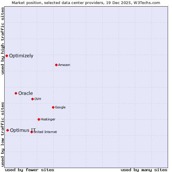 TechnologiesContent ManagementServer-side Languages Client-side Languages JavaScript Libraries CSS Frameworks Web Servers Web Panels Operating Systems Web Hosting Data Centers Reverse Proxies DNS Servers Email Servers SSL Certificate Authorities Content Delivery Traffic Analysis Tools Advertising Networks Tag Managers Social Widgets Site Elements Structured Data Markup Languages Character Encodings Image File Formats Top Level Domains Server Locations Content Languages | Technologies > Data Centers > Technology usage comparison Comparison of the usage statistics of Oracle vs. Optimus IT vs. Optimizely for websitesThis report shows the usage statistics of Oracle vs. Optimus IT vs. Optimizely as data center provider on the web. See technologies overview for explanations on the methodologies used in the surveys. Our reports are updated daily. UsageThis diagram shows the percentages of websites using the selected technologies. How to read the diagram: