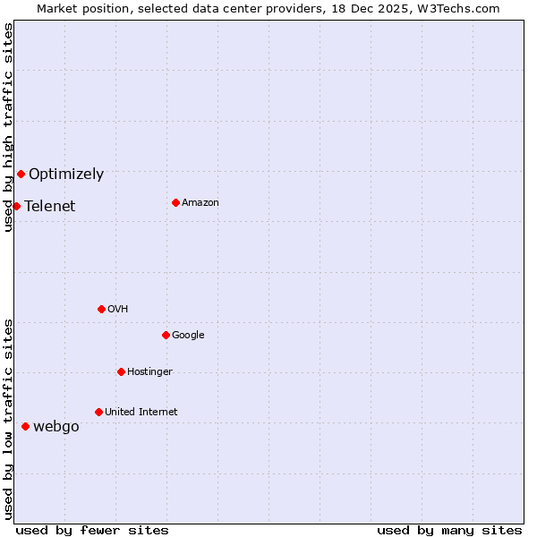 TechnologiesContent ManagementServer-side Languages Client-side Languages JavaScript Libraries CSS Frameworks Web Servers Web Panels Operating Systems Web Hosting Data Centers Reverse Proxies DNS Servers Email Servers SSL Certificate Authorities Content Delivery Traffic Analysis Tools Advertising Networks Tag Managers Social Widgets Site Elements Structured Data Markup Languages Character Encodings Image File Formats Top Level Domains Server Locations Content Languages | Technologies > Data Centers > Technology usage comparison Comparison of the usage statistics of webgo vs. Optimizely vs. Telenet for websitesThis report shows the usage statistics of webgo vs. Optimizely vs. Telenet as data center provider on the web. See technologies overview for explanations on the methodologies used in the surveys. Our reports are updated daily. UsageThis diagram shows the percentages of websites using the selected technologies. How to read the diagram: