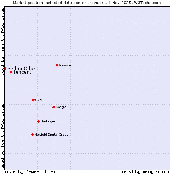 TechnologiesContent ManagementServer-side Languages Client-side Languages JavaScript Libraries CSS Frameworks Web Servers Web Panels Operating Systems Web Hosting Data Centers Reverse Proxies DNS Servers Email Servers SSL Certificate Authorities Content Delivery Traffic Analysis Tools Advertising Networks Tag Managers Social Widgets Site Elements Structured Data Markup Languages Character Encodings Image File Formats Top Level Domains Server Locations Content Languages ComparisonCompare with other | Technologies > Data Centers > Technology usage comparison Comparison of the usage statistics of Tencent vs. Sedmi Odjel for websitesThis report shows the usage statistics of Tencent vs. Sedmi Odjel as data center provider on the web. See technologies overview for explanations on the methodologies used in the surveys. Our reports are updated daily. UsageThis diagram shows the percentages of websites using the selected technologies. How to read the diagram:
