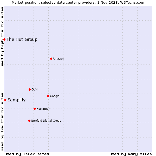 TechnologiesContent ManagementServer-side Languages Client-side Languages JavaScript Libraries CSS Frameworks Web Servers Web Panels Operating Systems Web Hosting Data Centers Reverse Proxies DNS Servers Email Servers SSL Certificate Authorities Content Delivery Traffic Analysis Tools Advertising Networks Tag Managers Social Widgets Site Elements Structured Data Markup Languages Character Encodings Image File Formats Top Level Domains Server Locations Content Languages ComparisonCompare with other | Technologies > Data Centers > Technology usage comparison Comparison of the usage statistics of Semplify vs. The Hut Group for websitesThis report shows the usage statistics of Semplify vs. The Hut Group as data center provider on the web. See technologies overview for explanations on the methodologies used in the surveys. Our reports are updated daily. UsageThis diagram shows the percentages of websites using the selected technologies. How to read the diagram: