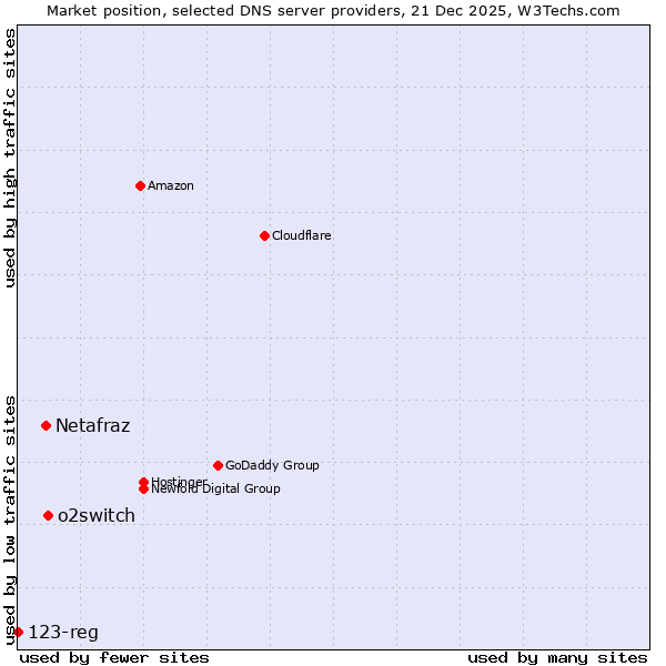 TechnologiesContent ManagementServer-side Languages Client-side Languages JavaScript Libraries CSS Frameworks Web Servers Web Panels Operating Systems Web Hosting Data Centers Reverse Proxies DNS Servers Email Servers SSL Certificate Authorities Content Delivery Traffic Analysis Tools Advertising Networks Tag Managers Social Widgets Site Elements Structured Data Markup Languages Character Encodings Image File Formats Top Level Domains Server Locations Content Languages | Technologies > DNS Servers > Technology usage comparison Comparison of the usage statistics of o2switch vs. Netafraz vs. 123-reg for websitesThis report shows the usage statistics of o2switch vs. Netafraz vs. 123-reg as DNS server provider on the web. See technologies overview for explanations on the methodologies used in the surveys. Our reports are updated daily. UsageThis diagram shows the percentages of websites using the selected technologies. How to read the diagram: