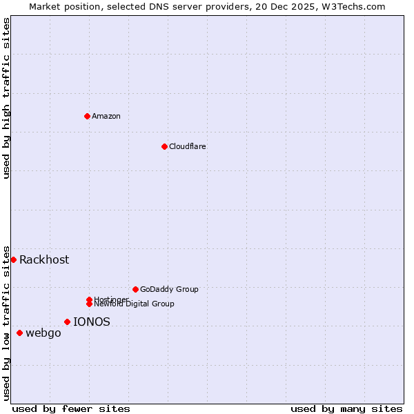 TechnologiesContent ManagementServer-side Languages Client-side Languages JavaScript Libraries CSS Frameworks Web Servers Web Panels Operating Systems Web Hosting Data Centers Reverse Proxies DNS Servers Email Servers SSL Certificate Authorities Content Delivery Traffic Analysis Tools Advertising Networks Tag Managers Social Widgets Site Elements Structured Data Markup Languages Character Encodings Image File Formats Top Level Domains Server Locations Content Languages | Technologies > DNS Servers > Technology usage comparison Comparison of the usage statistics of IONOS vs. webgo vs. Rackhost for websitesThis report shows the usage statistics of IONOS vs. webgo vs. Rackhost as DNS server provider on the web. See technologies overview for explanations on the methodologies used in the surveys. Our reports are updated daily. UsageThis diagram shows the percentages of websites using the selected technologies. How to read the diagram: