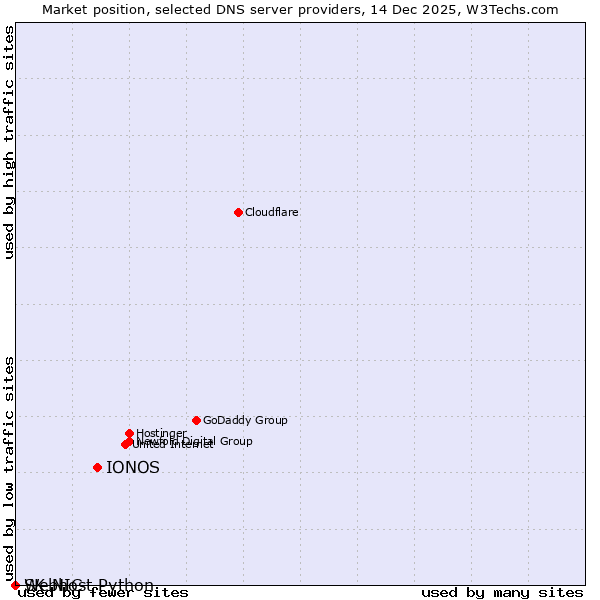 TechnologiesContent ManagementServer-side Languages Client-side Languages JavaScript Libraries CSS Frameworks Web Servers Web Panels Operating Systems Web Hosting Data Centers Reverse Proxies DNS Servers Email Servers SSL Certificate Authorities Content Delivery Traffic Analysis Tools Advertising Networks Tag Managers Social Widgets Site Elements Structured Data Markup Languages Character Encodings Image File Formats Top Level Domains Server Locations Content Languages | Technologies > DNS Servers > Technology usage comparison Comparison of the usage statistics of IONOS vs. SK-NIC vs. Webhost Python for websitesThis report shows the usage statistics of IONOS vs. SK-NIC vs. Webhost Python as DNS server provider on the web. See technologies overview for explanations on the methodologies used in the surveys. Our reports are updated daily. UsageThis diagram shows the percentages of websites using the selected technologies. How to read the diagram: