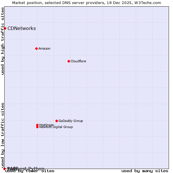 TechnologiesContent ManagementServer-side Languages Client-side Languages JavaScript Libraries CSS Frameworks Web Servers Web Panels Operating Systems Web Hosting Data Centers Reverse Proxies DNS Servers Email Servers SSL Certificate Authorities Content Delivery Traffic Analysis Tools Advertising Networks Tag Managers Social Widgets Site Elements Structured Data Markup Languages Character Encodings Image File Formats Top Level Domains Server Locations Content Languages | Technologies > DNS Servers > Technology usage comparison Comparison of the usage statistics of CDNetworks vs. 1API vs. Webhost Python for websitesThis report shows the usage statistics of CDNetworks vs. 1API vs. Webhost Python as DNS server provider on the web. See technologies overview for explanations on the methodologies used in the surveys. Our reports are updated daily. UsageThis diagram shows the percentages of websites using the selected technologies. How to read the diagram: