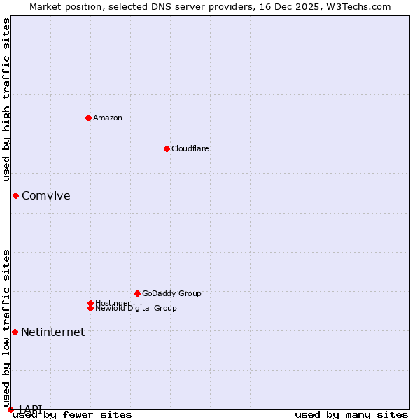 TechnologiesContent ManagementServer-side Languages Client-side Languages JavaScript Libraries CSS Frameworks Web Servers Web Panels Operating Systems Web Hosting Data Centers Reverse Proxies DNS Servers Email Servers SSL Certificate Authorities Content Delivery Traffic Analysis Tools Advertising Networks Tag Managers Social Widgets Site Elements Structured Data Markup Languages Character Encodings Image File Formats Top Level Domains Server Locations Content Languages | Technologies > DNS Servers > Technology usage comparison Comparison of the usage statistics of Comvive vs. Netinternet vs. 1API for websitesThis report shows the usage statistics of Comvive vs. Netinternet vs. 1API as DNS server provider on the web. See technologies overview for explanations on the methodologies used in the surveys. Our reports are updated daily. UsageThis diagram shows the percentages of websites using the selected technologies. How to read the diagram: