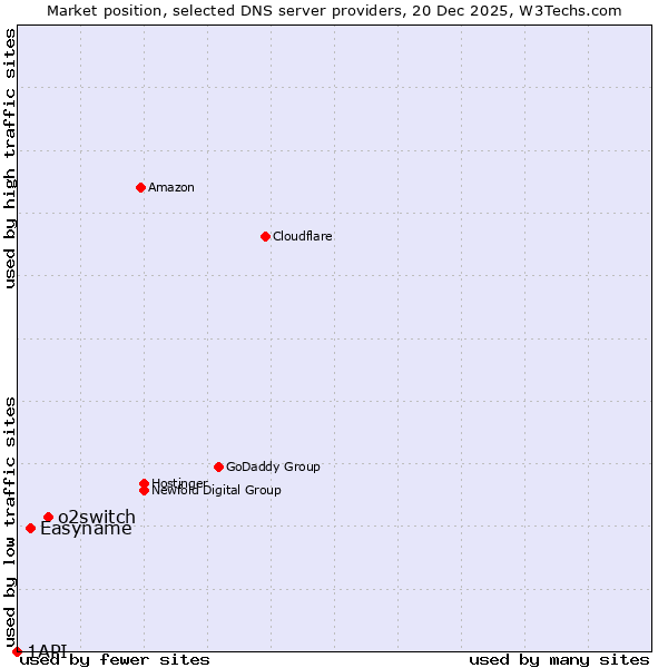 TechnologiesContent ManagementServer-side Languages Client-side Languages JavaScript Libraries CSS Frameworks Web Servers Web Panels Operating Systems Web Hosting Data Centers Reverse Proxies DNS Servers Email Servers SSL Certificate Authorities Content Delivery Traffic Analysis Tools Advertising Networks Tag Managers Social Widgets Site Elements Structured Data Markup Languages Character Encodings Image File Formats Top Level Domains Server Locations Content Languages | Technologies > DNS Servers > Technology usage comparison Comparison of the usage statistics of o2switch vs. Easyname vs. 1API for websitesThis report shows the usage statistics of o2switch vs. Easyname vs. 1API as DNS server provider on the web. See technologies overview for explanations on the methodologies used in the surveys. Our reports are updated daily. UsageThis diagram shows the percentages of websites using the selected technologies. How to read the diagram: