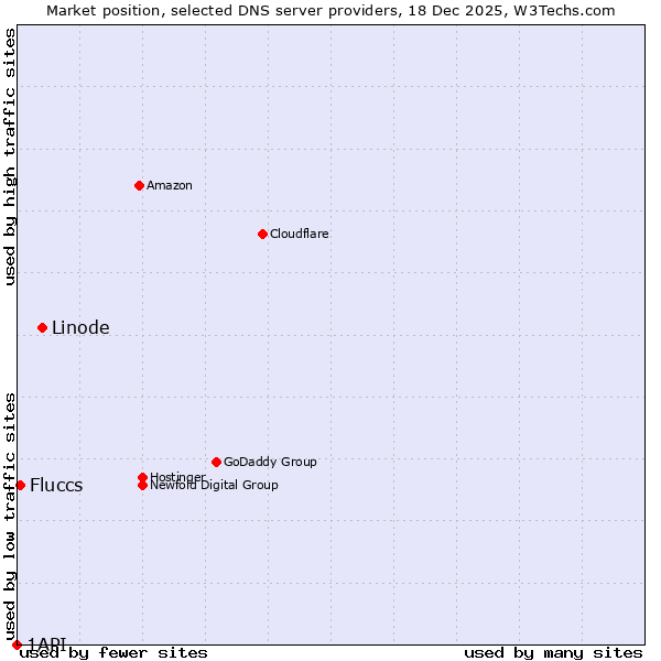 TechnologiesContent ManagementServer-side Languages Client-side Languages JavaScript Libraries CSS Frameworks Web Servers Web Panels Operating Systems Web Hosting Data Centers Reverse Proxies DNS Servers Email Servers SSL Certificate Authorities Content Delivery Traffic Analysis Tools Advertising Networks Tag Managers Social Widgets Site Elements Structured Data Markup Languages Character Encodings Image File Formats Top Level Domains Server Locations Content Languages | Technologies > DNS Servers > Technology usage comparison Comparison of the usage statistics of Linode vs. Fluccs vs. 1API for websitesThis report shows the usage statistics of Linode vs. Fluccs vs. 1API as DNS server provider on the web. See technologies overview for explanations on the methodologies used in the surveys. Our reports are updated daily. UsageThis diagram shows the percentages of websites using the selected technologies. How to read the diagram: