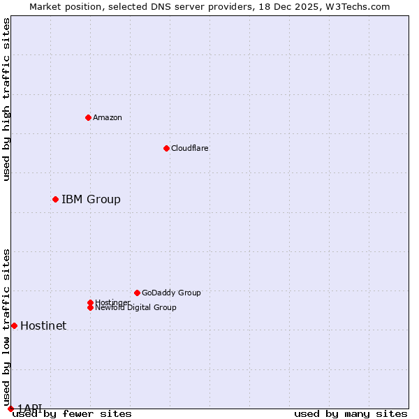 TechnologiesContent ManagementServer-side Languages Client-side Languages JavaScript Libraries CSS Frameworks Web Servers Web Panels Operating Systems Web Hosting Data Centers Reverse Proxies DNS Servers Email Servers SSL Certificate Authorities Content Delivery Traffic Analysis Tools Advertising Networks Tag Managers Social Widgets Site Elements Structured Data Markup Languages Character Encodings Image File Formats Top Level Domains Server Locations Content Languages | Technologies > DNS Servers > Technology usage comparison Comparison of the usage statistics of IBM Group vs. Hostinet vs. 1API for websitesThis report shows the usage statistics of IBM Group vs. Hostinet vs. 1API as DNS server provider on the web. See technologies overview for explanations on the methodologies used in the surveys. Our reports are updated daily. UsageThis diagram shows the percentages of websites using the selected technologies. How to read the diagram: