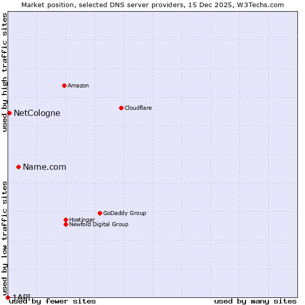 TechnologiesContent ManagementServer-side Languages Client-side Languages JavaScript Libraries CSS Frameworks Web Servers Web Panels Operating Systems Web Hosting Data Centers Reverse Proxies DNS Servers Email Servers SSL Certificate Authorities Content Delivery Traffic Analysis Tools Advertising Networks Tag Managers Social Widgets Site Elements Structured Data Markup Languages Character Encodings Image File Formats Top Level Domains Server Locations Content Languages | Technologies > DNS Servers > Technology usage comparison Comparison of the usage statistics of Name.com vs. NetCologne vs. 1API for websitesThis report shows the usage statistics of Name.com vs. NetCologne vs. 1API as DNS server provider on the web. See technologies overview for explanations on the methodologies used in the surveys. Our reports are updated daily. UsageThis diagram shows the percentages of websites using the selected technologies. How to read the diagram: