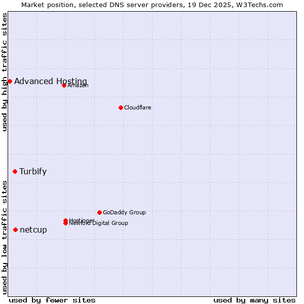 TechnologiesContent ManagementServer-side Languages Client-side Languages JavaScript Libraries CSS Frameworks Web Servers Web Panels Operating Systems Web Hosting Data Centers Reverse Proxies DNS Servers Email Servers SSL Certificate Authorities Content Delivery Traffic Analysis Tools Advertising Networks Tag Managers Social Widgets Site Elements Structured Data Markup Languages Character Encodings Image File Formats Top Level Domains Server Locations Content Languages | Technologies > DNS Servers > Technology usage comparison Comparison of the usage statistics of netcup vs. Turbify vs. Advanced Hosting for websitesThis report shows the usage statistics of netcup vs. Turbify vs. Advanced Hosting as DNS server provider on the web. See technologies overview for explanations on the methodologies used in the surveys. Our reports are updated daily. UsageThis diagram shows the percentages of websites using the selected technologies. How to read the diagram: