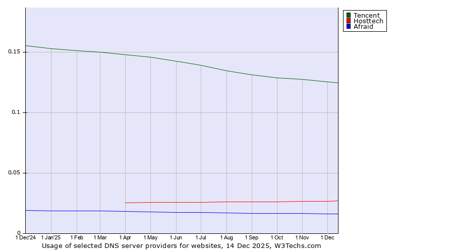 TechnologiesContent ManagementServer-side Languages Client-side Languages JavaScript Libraries CSS Frameworks Web Servers Web Panels Operating Systems Web Hosting Data Centers Reverse Proxies DNS Servers Email Servers SSL Certificate Authorities Content Delivery Traffic Analysis Tools Advertising Networks Tag Managers Social Widgets Site Elements Structured Data Markup Languages Character Encodings Image File Formats Top Level Domains Server Locations Content Languages | Technologies > DNS Servers > Technology usage comparison Comparison of the usage statistics of Tencent vs. Hosttech vs. Afraid for websitesThis report shows the usage statistics of Tencent vs. Hosttech vs. Afraid as DNS server provider on the web. See technologies overview for explanations on the methodologies used in the surveys. Our reports are updated daily. UsageThis diagram shows the percentages of websites using the selected technologies. How to read the diagram: