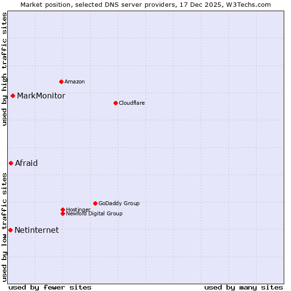 TechnologiesContent ManagementServer-side Languages Client-side Languages JavaScript Libraries CSS Frameworks Web Servers Web Panels Operating Systems Web Hosting Data Centers Reverse Proxies DNS Servers Email Servers SSL Certificate Authorities Content Delivery Traffic Analysis Tools Advertising Networks Tag Managers Social Widgets Site Elements Structured Data Markup Languages Character Encodings Image File Formats Top Level Domains Server Locations Content Languages | Technologies > DNS Servers > Technology usage comparison Comparison of the usage statistics of MarkMonitor vs. Afraid vs. Netinternet for websitesThis report shows the usage statistics of MarkMonitor vs. Afraid vs. Netinternet as DNS server provider on the web. See technologies overview for explanations on the methodologies used in the surveys. Our reports are updated daily. UsageThis diagram shows the percentages of websites using the selected technologies. How to read the diagram: