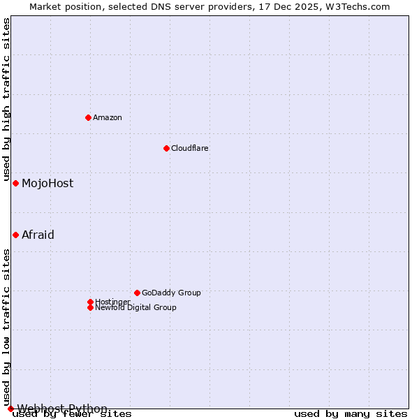TechnologiesContent ManagementServer-side Languages Client-side Languages JavaScript Libraries CSS Frameworks Web Servers Web Panels Operating Systems Web Hosting Data Centers Reverse Proxies DNS Servers Email Servers SSL Certificate Authorities Content Delivery Traffic Analysis Tools Advertising Networks Tag Managers Social Widgets Site Elements Structured Data Markup Languages Character Encodings Image File Formats Top Level Domains Server Locations Content Languages | Technologies > DNS Servers > Technology usage comparison Comparison of the usage statistics of MojoHost vs. Afraid vs. Webhost Python for websitesThis report shows the usage statistics of MojoHost vs. Afraid vs. Webhost Python as DNS server provider on the web. See technologies overview for explanations on the methodologies used in the surveys. Our reports are updated daily. UsageThis diagram shows the percentages of websites using the selected technologies. How to read the diagram: