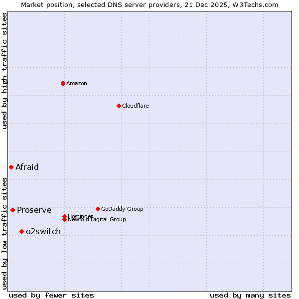 TechnologiesContent ManagementServer-side Languages Client-side Languages JavaScript Libraries CSS Frameworks Web Servers Web Panels Operating Systems Web Hosting Data Centers Reverse Proxies DNS Servers Email Servers SSL Certificate Authorities Content Delivery Traffic Analysis Tools Advertising Networks Tag Managers Social Widgets Site Elements Structured Data Markup Languages Character Encodings Image File Formats Top Level Domains Server Locations Content Languages | Technologies > DNS Servers > Technology usage comparison Comparison of the usage statistics of o2switch vs. Proserve vs. Afraid for websitesThis report shows the usage statistics of o2switch vs. Proserve vs. Afraid as DNS server provider on the web. See technologies overview for explanations on the methodologies used in the surveys. Our reports are updated daily. UsageThis diagram shows the percentages of websites using the selected technologies. How to read the diagram: