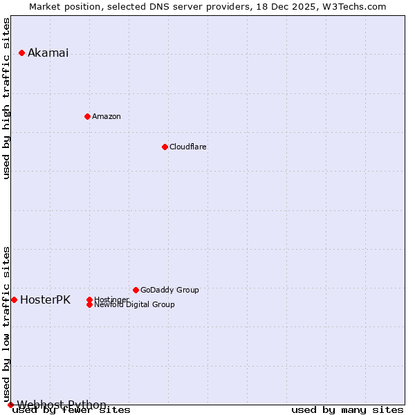 TechnologiesContent ManagementServer-side Languages Client-side Languages JavaScript Libraries CSS Frameworks Web Servers Web Panels Operating Systems Web Hosting Data Centers Reverse Proxies DNS Servers Email Servers SSL Certificate Authorities Content Delivery Traffic Analysis Tools Advertising Networks Tag Managers Social Widgets Site Elements Structured Data Markup Languages Character Encodings Image File Formats Top Level Domains Server Locations Content Languages | Technologies > DNS Servers > Technology usage comparison Comparison of the usage statistics of Akamai vs. HosterPK vs. Webhost Python for websitesThis report shows the usage statistics of Akamai vs. HosterPK vs. Webhost Python as DNS server provider on the web. See technologies overview for explanations on the methodologies used in the surveys. Our reports are updated daily. UsageThis diagram shows the percentages of websites using the selected technologies. How to read the diagram: