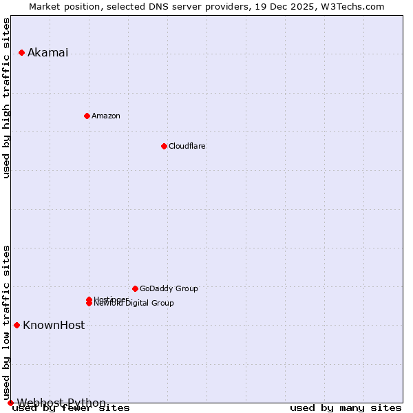 TechnologiesContent ManagementServer-side Languages Client-side Languages JavaScript Libraries CSS Frameworks Web Servers Web Panels Operating Systems Web Hosting Data Centers Reverse Proxies DNS Servers Email Servers SSL Certificate Authorities Content Delivery Traffic Analysis Tools Advertising Networks Tag Managers Social Widgets Site Elements Structured Data Markup Languages Character Encodings Image File Formats Top Level Domains Server Locations Content Languages | Technologies > DNS Servers > Technology usage comparison Comparison of the usage statistics of Akamai vs. KnownHost vs. Webhost Python for websitesThis report shows the usage statistics of Akamai vs. KnownHost vs. Webhost Python as DNS server provider on the web. See technologies overview for explanations on the methodologies used in the surveys. Our reports are updated daily. UsageThis diagram shows the percentages of websites using the selected technologies. How to read the diagram: