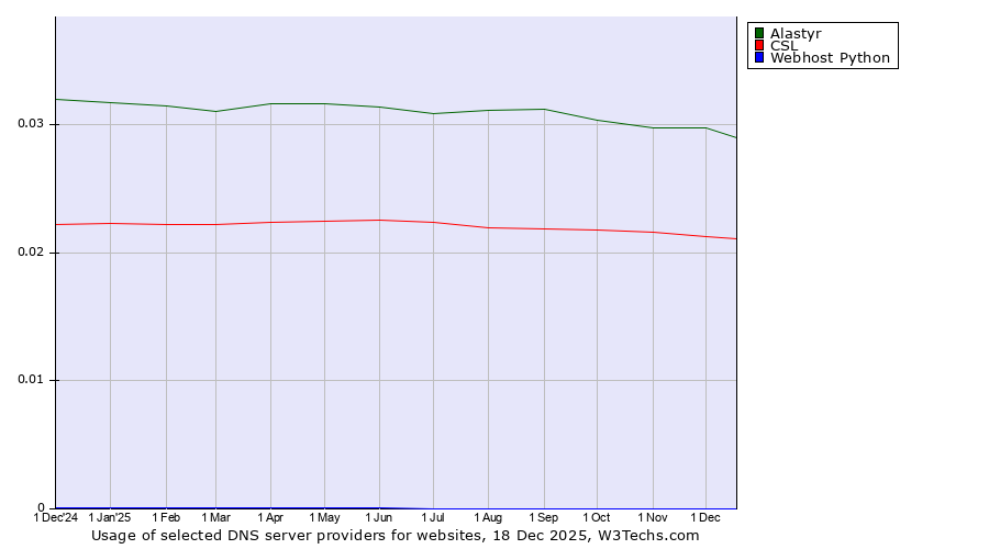 TechnologiesContent ManagementServer-side Languages Client-side Languages JavaScript Libraries CSS Frameworks Web Servers Web Panels Operating Systems Web Hosting Data Centers Reverse Proxies DNS Servers Email Servers SSL Certificate Authorities Content Delivery Traffic Analysis Tools Advertising Networks Tag Managers Social Widgets Site Elements Structured Data Markup Languages Character Encodings Image File Formats Top Level Domains Server Locations Content Languages | Technologies > DNS Servers > Technology usage comparison Comparison of the usage statistics of Alastyr vs. CSL vs. Webhost Python for websitesThis report shows the usage statistics of Alastyr vs. CSL vs. Webhost Python as DNS server provider on the web. See technologies overview for explanations on the methodologies used in the surveys. Our reports are updated daily. UsageThis diagram shows the percentages of websites using the selected technologies. How to read the diagram: