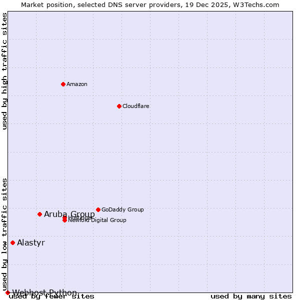 TechnologiesContent ManagementServer-side Languages Client-side Languages JavaScript Libraries CSS Frameworks Web Servers Web Panels Operating Systems Web Hosting Data Centers Reverse Proxies DNS Servers Email Servers SSL Certificate Authorities Content Delivery Traffic Analysis Tools Advertising Networks Tag Managers Social Widgets Site Elements Structured Data Markup Languages Character Encodings Image File Formats Top Level Domains Server Locations Content Languages | Technologies > DNS Servers > Technology usage comparison Comparison of the usage statistics of Aruba Group vs. Alastyr vs. Webhost Python for websitesThis report shows the usage statistics of Aruba Group vs. Alastyr vs. Webhost Python as DNS server provider on the web. See technologies overview for explanations on the methodologies used in the surveys. Our reports are updated daily. UsageThis diagram shows the percentages of websites using the selected technologies. How to read the diagram: