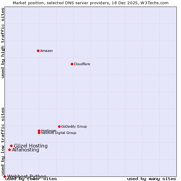 TechnologiesContent ManagementServer-side Languages Client-side Languages JavaScript Libraries CSS Frameworks Web Servers Web Panels Operating Systems Web Hosting Data Centers Reverse Proxies DNS Servers Email Servers SSL Certificate Authorities Content Delivery Traffic Analysis Tools Advertising Networks Tag Managers Social Widgets Site Elements Structured Data Markup Languages Character Encodings Image File Formats Top Level Domains Server Locations Content Languages | Technologies > DNS Servers > Technology usage comparison Comparison of the usage statistics of Güzel Hosting vs. Alfahosting vs. Webhost Python for websitesThis report shows the usage statistics of Güzel Hosting vs. Alfahosting vs. Webhost Python as DNS server provider on the web. See technologies overview for explanations on the methodologies used in the surveys. Our reports are updated daily. UsageThis diagram shows the percentages of websites using the selected technologies. How to read the diagram: