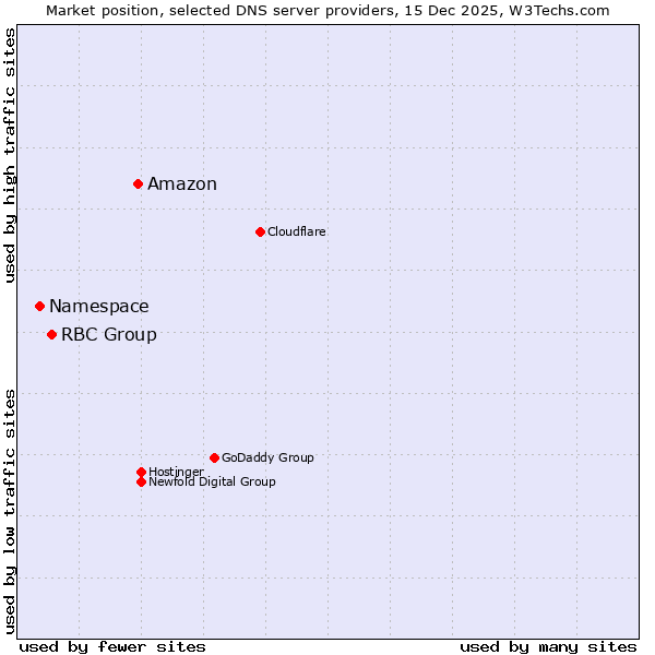 TechnologiesContent ManagementServer-side Languages Client-side Languages JavaScript Libraries CSS Frameworks Web Servers Web Panels Operating Systems Web Hosting Data Centers Reverse Proxies DNS Servers Email Servers SSL Certificate Authorities Content Delivery Traffic Analysis Tools Advertising Networks Tag Managers Social Widgets Site Elements Structured Data Markup Languages Character Encodings Image File Formats Top Level Domains Server Locations Content Languages | Technologies > DNS Servers > Technology usage comparison Comparison of the usage statistics of Amazon vs. RBC Group vs. Namespace for websitesThis report shows the usage statistics of Amazon vs. RBC Group vs. Namespace as DNS server provider on the web. See technologies overview for explanations on the methodologies used in the surveys. Our reports are updated daily. UsageThis diagram shows the percentages of websites using the selected technologies. How to read the diagram: