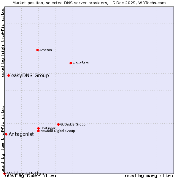 TechnologiesContent ManagementServer-side Languages Client-side Languages JavaScript Libraries CSS Frameworks Web Servers Web Panels Operating Systems Web Hosting Data Centers Reverse Proxies DNS Servers Email Servers SSL Certificate Authorities Content Delivery Traffic Analysis Tools Advertising Networks Tag Managers Social Widgets Site Elements Structured Data Markup Languages Character Encodings Image File Formats Top Level Domains Server Locations Content Languages | Technologies > DNS Servers > Technology usage comparison Comparison of the usage statistics of easyDNS Group vs. Antagonist vs. Webhost Python for websitesThis report shows the usage statistics of easyDNS Group vs. Antagonist vs. Webhost Python as DNS server provider on the web. See technologies overview for explanations on the methodologies used in the surveys. Our reports are updated daily. UsageThis diagram shows the percentages of websites using the selected technologies. How to read the diagram:
