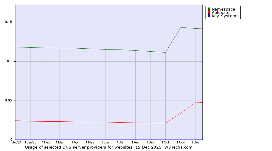 TechnologiesContent ManagementServer-side Languages Client-side Languages JavaScript Libraries CSS Frameworks Web Servers Web Panels Operating Systems Web Hosting Data Centers Reverse Proxies DNS Servers Email Servers SSL Certificate Authorities Content Delivery Traffic Analysis Tools Advertising Networks Tag Managers Social Widgets Site Elements Structured Data Markup Languages Character Encodings Image File Formats Top Level Domains Server Locations Content Languages | Technologies > DNS Servers > Technology usage comparison Comparison of the usage statistics of Namespace vs. Aplus.net vs. Key-Systems for websitesThis report shows the usage statistics of Namespace vs. Aplus.net vs. Key-Systems as DNS server provider on the web. See technologies overview for explanations on the methodologies used in the surveys. Our reports are updated daily. UsageThis diagram shows the percentages of websites using the selected technologies. How to read the diagram: