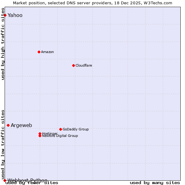 TechnologiesContent ManagementServer-side Languages Client-side Languages JavaScript Libraries CSS Frameworks Web Servers Web Panels Operating Systems Web Hosting Data Centers Reverse Proxies DNS Servers Email Servers SSL Certificate Authorities Content Delivery Traffic Analysis Tools Advertising Networks Tag Managers Social Widgets Site Elements Structured Data Markup Languages Character Encodings Image File Formats Top Level Domains Server Locations Content Languages | Technologies > DNS Servers > Technology usage comparison Comparison of the usage statistics of Argeweb vs. Yahoo vs. Webhost Python for websitesThis report shows the usage statistics of Argeweb vs. Yahoo vs. Webhost Python as DNS server provider on the web. See technologies overview for explanations on the methodologies used in the surveys. Our reports are updated daily. UsageThis diagram shows the percentages of websites using the selected technologies. How to read the diagram: