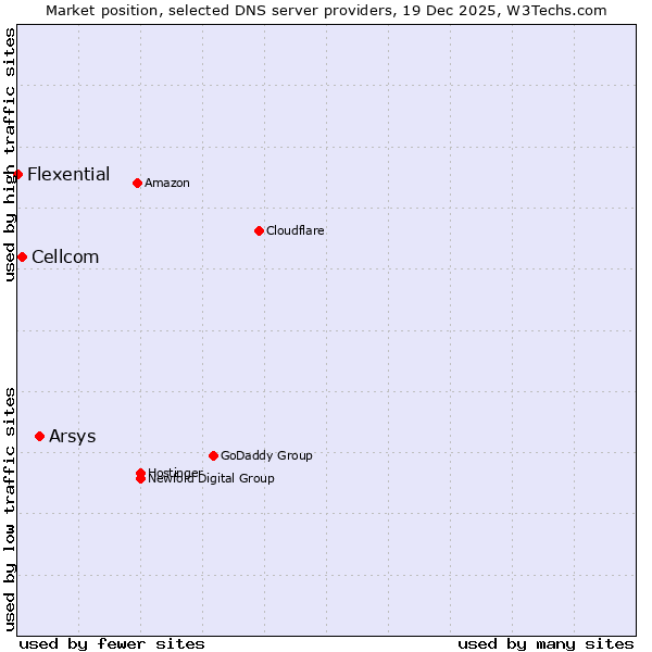 TechnologiesContent ManagementServer-side Languages Client-side Languages JavaScript Libraries CSS Frameworks Web Servers Web Panels Operating Systems Web Hosting Data Centers Reverse Proxies DNS Servers Email Servers SSL Certificate Authorities Content Delivery Traffic Analysis Tools Advertising Networks Tag Managers Social Widgets Site Elements Structured Data Markup Languages Character Encodings Image File Formats Top Level Domains Server Locations Content Languages | Technologies > DNS Servers > Technology usage comparison Comparison of the usage statistics of Arsys vs. Cellcom vs. Flexential for websitesThis report shows the usage statistics of Arsys vs. Cellcom vs. Flexential as DNS server provider on the web. See technologies overview for explanations on the methodologies used in the surveys. Our reports are updated daily. UsageThis diagram shows the percentages of websites using the selected technologies. How to read the diagram: