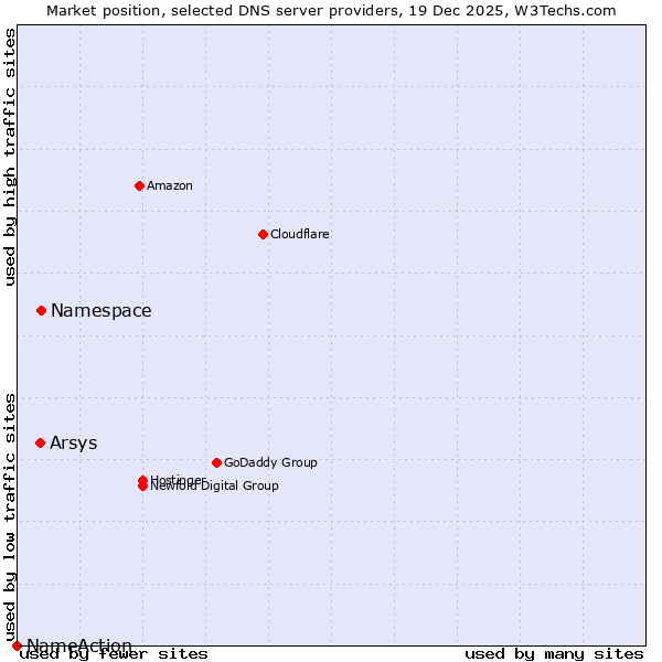 TechnologiesContent ManagementServer-side Languages Client-side Languages JavaScript Libraries CSS Frameworks Web Servers Web Panels Operating Systems Web Hosting Data Centers Reverse Proxies DNS Servers Email Servers SSL Certificate Authorities Content Delivery Traffic Analysis Tools Advertising Networks Tag Managers Social Widgets Site Elements Structured Data Markup Languages Character Encodings Image File Formats Top Level Domains Server Locations Content Languages | Technologies > DNS Servers > Technology usage comparison Comparison of the usage statistics of Namespace vs. Arsys vs. NameAction for websitesThis report shows the usage statistics of Namespace vs. Arsys vs. NameAction as DNS server provider on the web. See technologies overview for explanations on the methodologies used in the surveys. Our reports are updated daily. UsageThis diagram shows the percentages of websites using the selected technologies. How to read the diagram: