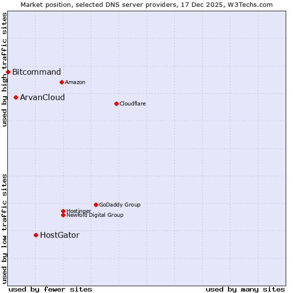 TechnologiesContent ManagementServer-side Languages Client-side Languages JavaScript Libraries CSS Frameworks Web Servers Web Panels Operating Systems Web Hosting Data Centers Reverse Proxies DNS Servers Email Servers SSL Certificate Authorities Content Delivery Traffic Analysis Tools Advertising Networks Tag Managers Social Widgets Site Elements Structured Data Markup Languages Character Encodings Image File Formats Top Level Domains Server Locations Content Languages | Technologies > DNS Servers > Technology usage comparison Comparison of the usage statistics of HostGator vs. ArvanCloud vs. Bitcommand for websitesThis report shows the usage statistics of HostGator vs. ArvanCloud vs. Bitcommand as DNS server provider on the web. See technologies overview for explanations on the methodologies used in the surveys. Our reports are updated daily. UsageThis diagram shows the percentages of websites using the selected technologies. How to read the diagram: