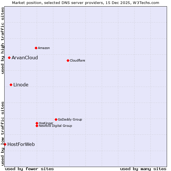 TechnologiesContent ManagementServer-side Languages Client-side Languages JavaScript Libraries CSS Frameworks Web Servers Web Panels Operating Systems Web Hosting Data Centers Reverse Proxies DNS Servers Email Servers SSL Certificate Authorities Content Delivery Traffic Analysis Tools Advertising Networks Tag Managers Social Widgets Site Elements Structured Data Markup Languages Character Encodings Image File Formats Top Level Domains Server Locations Content Languages | Technologies > DNS Servers > Technology usage comparison Comparison of the usage statistics of Linode vs. ArvanCloud vs. HostForWeb for websitesThis report shows the usage statistics of Linode vs. ArvanCloud vs. HostForWeb as DNS server provider on the web. See technologies overview for explanations on the methodologies used in the surveys. Our reports are updated daily. UsageThis diagram shows the percentages of websites using the selected technologies. How to read the diagram: