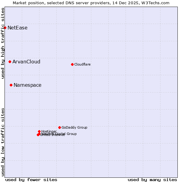 TechnologiesContent ManagementServer-side Languages Client-side Languages JavaScript Libraries CSS Frameworks Web Servers Web Panels Operating Systems Web Hosting Data Centers Reverse Proxies DNS Servers Email Servers SSL Certificate Authorities Content Delivery Traffic Analysis Tools Advertising Networks Tag Managers Social Widgets Site Elements Structured Data Markup Languages Character Encodings Image File Formats Top Level Domains Server Locations Content Languages | Technologies > DNS Servers > Technology usage comparison Comparison of the usage statistics of Namespace vs. ArvanCloud vs. NetEase for websitesThis report shows the usage statistics of Namespace vs. ArvanCloud vs. NetEase as DNS server provider on the web. See technologies overview for explanations on the methodologies used in the surveys. Our reports are updated daily. UsageThis diagram shows the percentages of websites using the selected technologies. How to read the diagram: