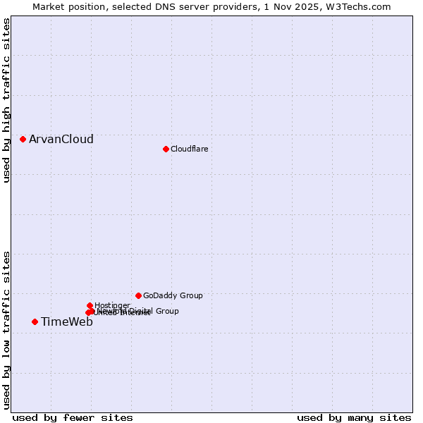 TechnologiesContent ManagementServer-side Languages Client-side Languages JavaScript Libraries CSS Frameworks Web Servers Web Panels Operating Systems Web Hosting Data Centers Reverse Proxies DNS Servers Email Servers SSL Certificate Authorities Content Delivery Traffic Analysis Tools Advertising Networks Tag Managers Social Widgets Site Elements Structured Data Markup Languages Character Encodings Image File Formats Top Level Domains Server Locations Content Languages ComparisonCompare with other | Technologies > DNS Servers > Technology usage comparison Comparison of the usage statistics of TimeWeb vs. ArvanCloud for websitesThis report shows the usage statistics of TimeWeb vs. ArvanCloud as DNS server provider on the web. See technologies overview for explanations on the methodologies used in the surveys. Our reports are updated daily. UsageThis diagram shows the percentages of websites using the selected technologies. How to read the diagram: