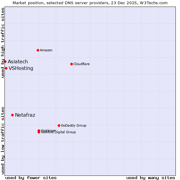 TechnologiesContent ManagementServer-side Languages Client-side Languages JavaScript Libraries CSS Frameworks Web Servers Web Panels Operating Systems Web Hosting Data Centers Reverse Proxies DNS Servers Email Servers SSL Certificate Authorities Content Delivery Traffic Analysis Tools Advertising Networks Tag Managers Social Widgets Site Elements Structured Data Markup Languages Character Encodings Image File Formats Top Level Domains Server Locations Content Languages | Technologies > DNS Servers > Technology usage comparison Comparison of the usage statistics of Netafraz vs. VSHosting vs. Asiatech for websitesThis report shows the usage statistics of Netafraz vs. VSHosting vs. Asiatech as DNS server provider on the web. See technologies overview for explanations on the methodologies used in the surveys. Our reports are updated daily. UsageThis diagram shows the percentages of websites using the selected technologies. How to read the diagram: