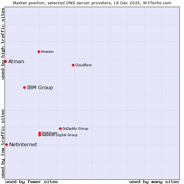 TechnologiesContent ManagementServer-side Languages Client-side Languages JavaScript Libraries CSS Frameworks Web Servers Web Panels Operating Systems Web Hosting Data Centers Reverse Proxies DNS Servers Email Servers SSL Certificate Authorities Content Delivery Traffic Analysis Tools Advertising Networks Tag Managers Social Widgets Site Elements Structured Data Markup Languages Character Encodings Image File Formats Top Level Domains Server Locations Content Languages | Technologies > DNS Servers > Technology usage comparison Comparison of the usage statistics of IBM Group vs. Netinternet vs. Atman for websitesThis report shows the usage statistics of IBM Group vs. Netinternet vs. Atman as DNS server provider on the web. See technologies overview for explanations on the methodologies used in the surveys. Our reports are updated daily. UsageThis diagram shows the percentages of websites using the selected technologies. How to read the diagram: