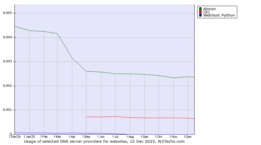 TechnologiesContent ManagementServer-side Languages Client-side Languages JavaScript Libraries CSS Frameworks Web Servers Web Panels Operating Systems Web Hosting Data Centers Reverse Proxies DNS Servers Email Servers SSL Certificate Authorities Content Delivery Traffic Analysis Tools Advertising Networks Tag Managers Social Widgets Site Elements Structured Data Markup Languages Character Encodings Image File Formats Top Level Domains Server Locations Content Languages | Technologies > DNS Servers > Technology usage comparison Comparison of the usage statistics of Atman vs. I3C vs. Webhost Python for websitesThis report shows the usage statistics of Atman vs. I3C vs. Webhost Python as DNS server provider on the web. See technologies overview for explanations on the methodologies used in the surveys. Our reports are updated daily. UsageThis diagram shows the percentages of websites using the selected technologies. How to read the diagram: