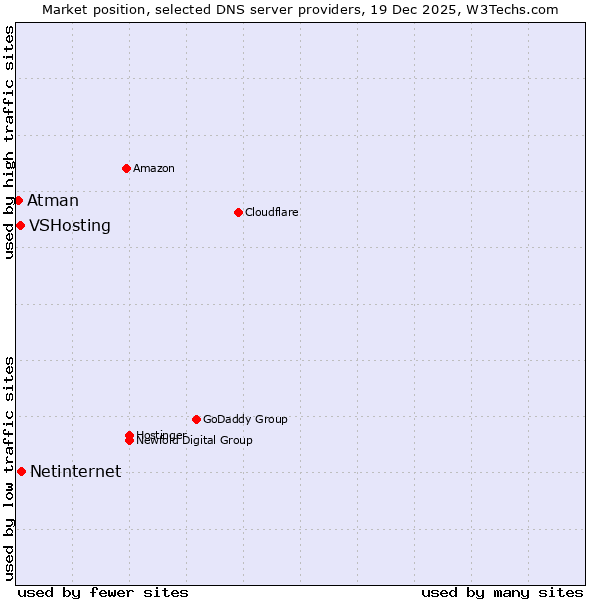 TechnologiesContent ManagementServer-side Languages Client-side Languages JavaScript Libraries CSS Frameworks Web Servers Web Panels Operating Systems Web Hosting Data Centers Reverse Proxies DNS Servers Email Servers SSL Certificate Authorities Content Delivery Traffic Analysis Tools Advertising Networks Tag Managers Social Widgets Site Elements Structured Data Markup Languages Character Encodings Image File Formats Top Level Domains Server Locations Content Languages | Technologies > DNS Servers > Technology usage comparison Comparison of the usage statistics of Netinternet vs. VSHosting vs. Atman for websitesThis report shows the usage statistics of Netinternet vs. VSHosting vs. Atman as DNS server provider on the web. See technologies overview for explanations on the methodologies used in the surveys. Our reports are updated daily. UsageThis diagram shows the percentages of websites using the selected technologies. How to read the diagram:
