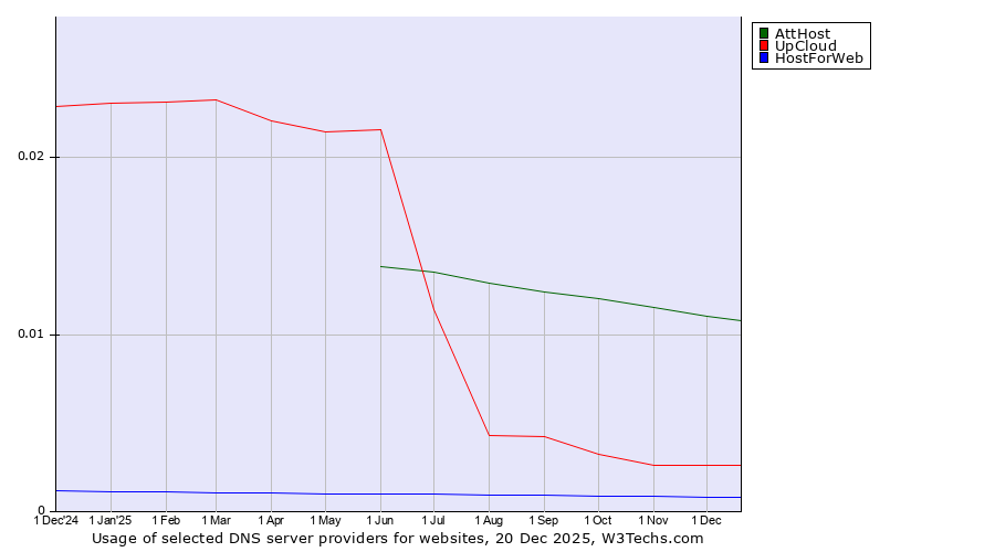 TechnologiesContent ManagementServer-side Languages Client-side Languages JavaScript Libraries CSS Frameworks Web Servers Web Panels Operating Systems Web Hosting Data Centers Reverse Proxies DNS Servers Email Servers SSL Certificate Authorities Content Delivery Traffic Analysis Tools Advertising Networks Tag Managers Social Widgets Site Elements Structured Data Markup Languages Character Encodings Image File Formats Top Level Domains Server Locations Content Languages | Technologies > DNS Servers > Technology usage comparison Comparison of the usage statistics of AttHost vs. UpCloud vs. HostForWeb for websitesThis report shows the usage statistics of AttHost vs. UpCloud vs. HostForWeb as DNS server provider on the web. See technologies overview for explanations on the methodologies used in the surveys. Our reports are updated daily. UsageThis diagram shows the percentages of websites using the selected technologies. How to read the diagram: