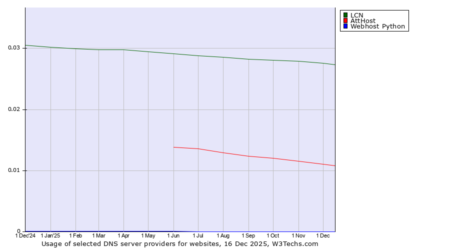 TechnologiesContent ManagementServer-side Languages Client-side Languages JavaScript Libraries CSS Frameworks Web Servers Web Panels Operating Systems Web Hosting Data Centers Reverse Proxies DNS Servers Email Servers SSL Certificate Authorities Content Delivery Traffic Analysis Tools Advertising Networks Tag Managers Social Widgets Site Elements Structured Data Markup Languages Character Encodings Image File Formats Top Level Domains Server Locations Content Languages | Technologies > DNS Servers > Technology usage comparison Comparison of the usage statistics of LCN vs. AttHost vs. Webhost Python for websitesThis report shows the usage statistics of LCN vs. AttHost vs. Webhost Python as DNS server provider on the web. See technologies overview for explanations on the methodologies used in the surveys. Our reports are updated daily. UsageThis diagram shows the percentages of websites using the selected technologies. How to read the diagram: