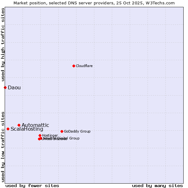 TechnologiesContent ManagementServer-side Languages Client-side Languages JavaScript Libraries CSS Frameworks Web Servers Web Panels Operating Systems Web Hosting Data Centers Reverse Proxies DNS Servers Email Servers SSL Certificate Authorities Content Delivery Traffic Analysis Tools Advertising Networks Tag Managers Social Widgets Site Elements Structured Data Markup Languages Character Encodings Image File Formats Top Level Domains Server Locations Content Languages | Technologies > DNS Servers > Technology usage comparison Comparison of the usage statistics of Automattic vs. ScalaHosting vs. Daou for websitesThis report shows the usage statistics of Automattic vs. ScalaHosting vs. Daou as DNS server provider on the web. See technologies overview for explanations on the methodologies used in the surveys. Our reports are updated daily. UsageThis diagram shows the percentages of websites using the selected technologies. How to read the diagram: