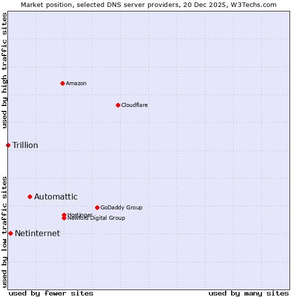 TechnologiesContent ManagementServer-side Languages Client-side Languages JavaScript Libraries CSS Frameworks Web Servers Web Panels Operating Systems Web Hosting Data Centers Reverse Proxies DNS Servers Email Servers SSL Certificate Authorities Content Delivery Traffic Analysis Tools Advertising Networks Tag Managers Social Widgets Site Elements Structured Data Markup Languages Character Encodings Image File Formats Top Level Domains Server Locations Content Languages | Technologies > DNS Servers > Technology usage comparison Comparison of the usage statistics of Automattic vs. Netinternet vs. Trillion for websitesThis report shows the usage statistics of Automattic vs. Netinternet vs. Trillion as DNS server provider on the web. See technologies overview for explanations on the methodologies used in the surveys. Our reports are updated daily. UsageThis diagram shows the percentages of websites using the selected technologies. How to read the diagram: